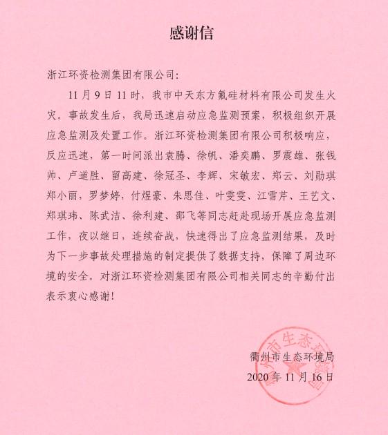 近日,浙江環(huán)資檢測(cè)集團(tuán)有限公司收到來(lái)自衢州市生態(tài)環(huán)境局的《感謝信》,感謝環(huán)資檢測(cè)集團(tuán)在11月9日本市中天東方氟硅材料有限公司發(fā)生火災(zāi)衢州市生態(tài)環(huán)境局啟動(dòng)的應(yīng)急預(yù)案中,積極響應(yīng),快速反應(yīng),抽派23名精干人員夜以繼日,連續(xù)奮戰(zhàn)3天3夜,快速提供應(yīng)急監(jiān)測(cè)結(jié)果,及時(shí)為事故處理措施提供數(shù)據(jù)支持,保障周邊環(huán)境安全。對(duì)環(huán)資檢測(cè)集團(tuán)相關(guān)人員辛勤的付出表示衷心感謝!